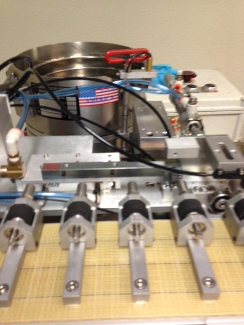 Sumitomo, a global company that’s involved in metal products, transportation, and construction, environment and infrastructure, chemical and electronics industries, was looking to update its equipment and help speed up the butt splice coloring process. Rob Greiner, P.E., at Carlsbad, California- based Smart Engineering Systems, said Sumitomo’s system for applying color to butt splices involves collecting parts into a vibratory bowl and then moving them down a linear feeder where a cylinder pushes them onto a rotating spindle. After the color is applied, the spindle is pulled away and the parts fall into a bin.